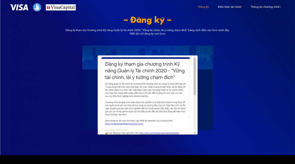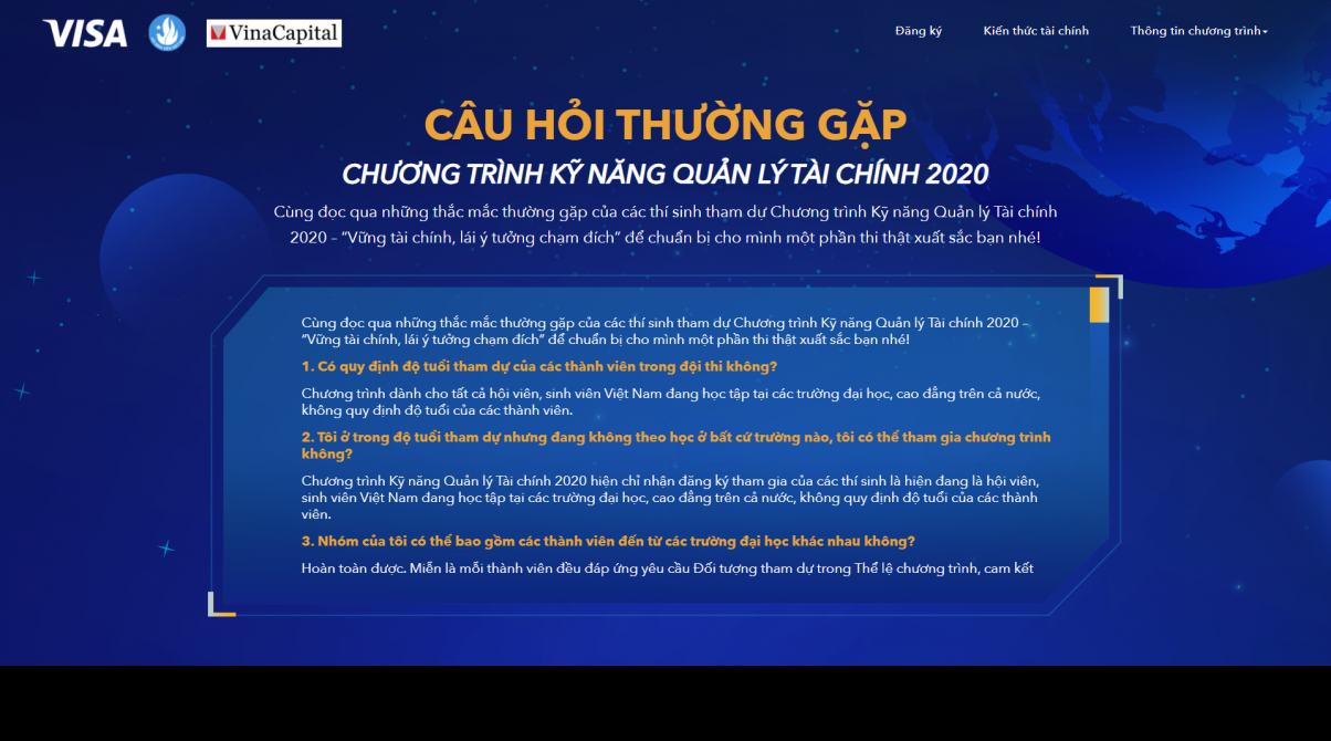 OpsGreat develop front-end, animations, content management system (CMS) and auto generate posters for Team’s start-up idea registration on the Microsite Chương trình Kỹ năng Quản lý Tài chính 2020 – Vững Tài Chính Lái Ý Tưởng Chạm Đích; website https://www.kynangquanlytaichinh2020.com/
