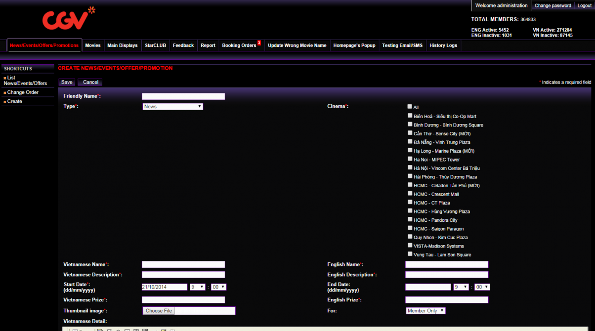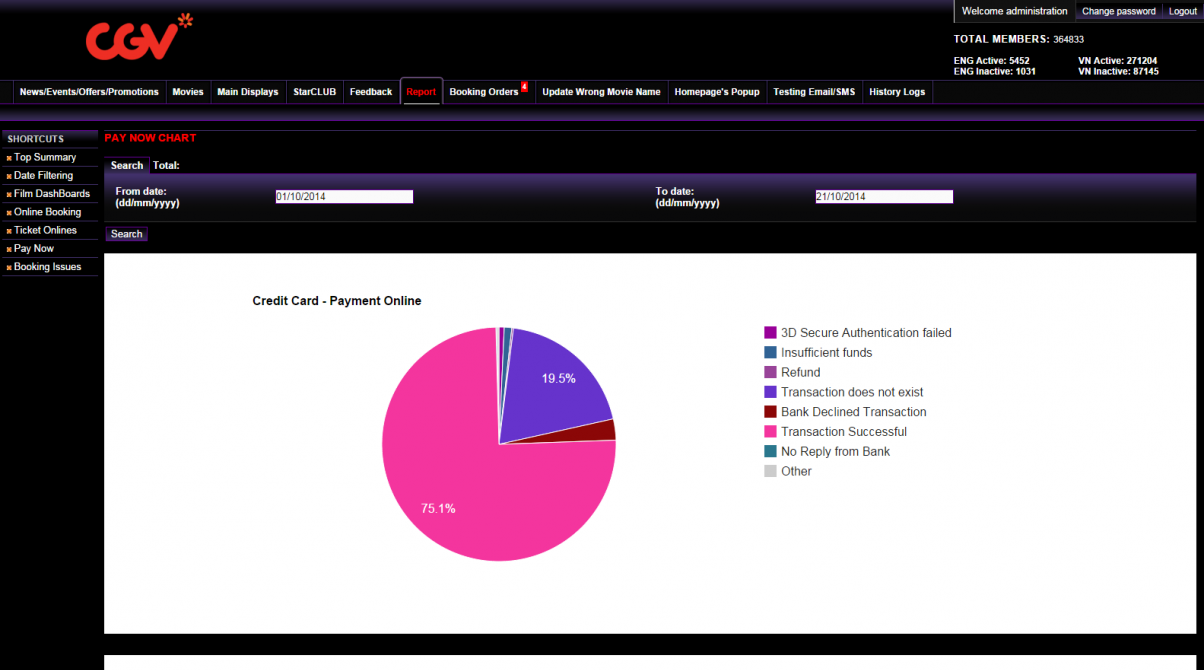 Công việc của chúng tôi tập trung vào việc hỗ trợ và xử các vấn đề kỹ thuật liên quan đến Vista Internet Ticketing và cổng kết nối API các bên thứ ba bao gồm: cổng gửi email, cổng gửi tin nhắn, cổng thanh toán trực tuyến – Onepay; ngoài ra chúng tôi cũng xử lý và điều chỉnh các tính năng và cải tiến liên quan đến hệ thống website CGV.