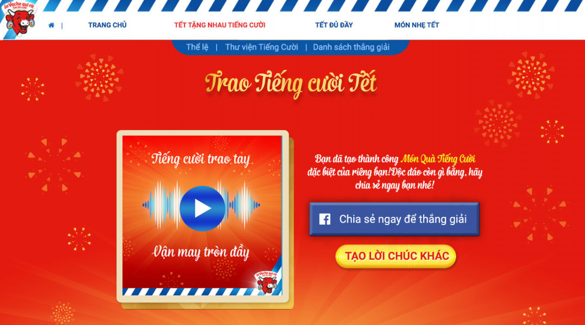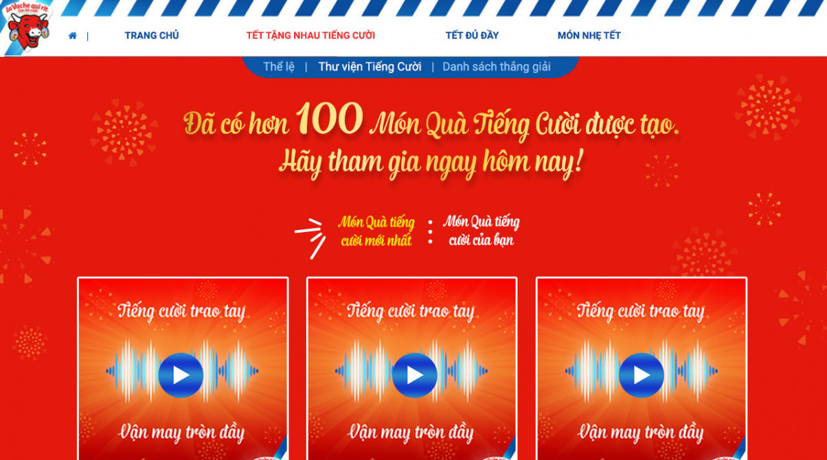 OpsGreat đã thiết kế và phát triển chương trình Trao Tiếng Cười Tết cho nhãn hàng Phô Mai Con Bò Cười. Người chơi tham gia chương trình tạo Món quà tiếng cười trực tuyến ngay trên website (chạy trên máy tính và điện thoại) làm theo các bước: